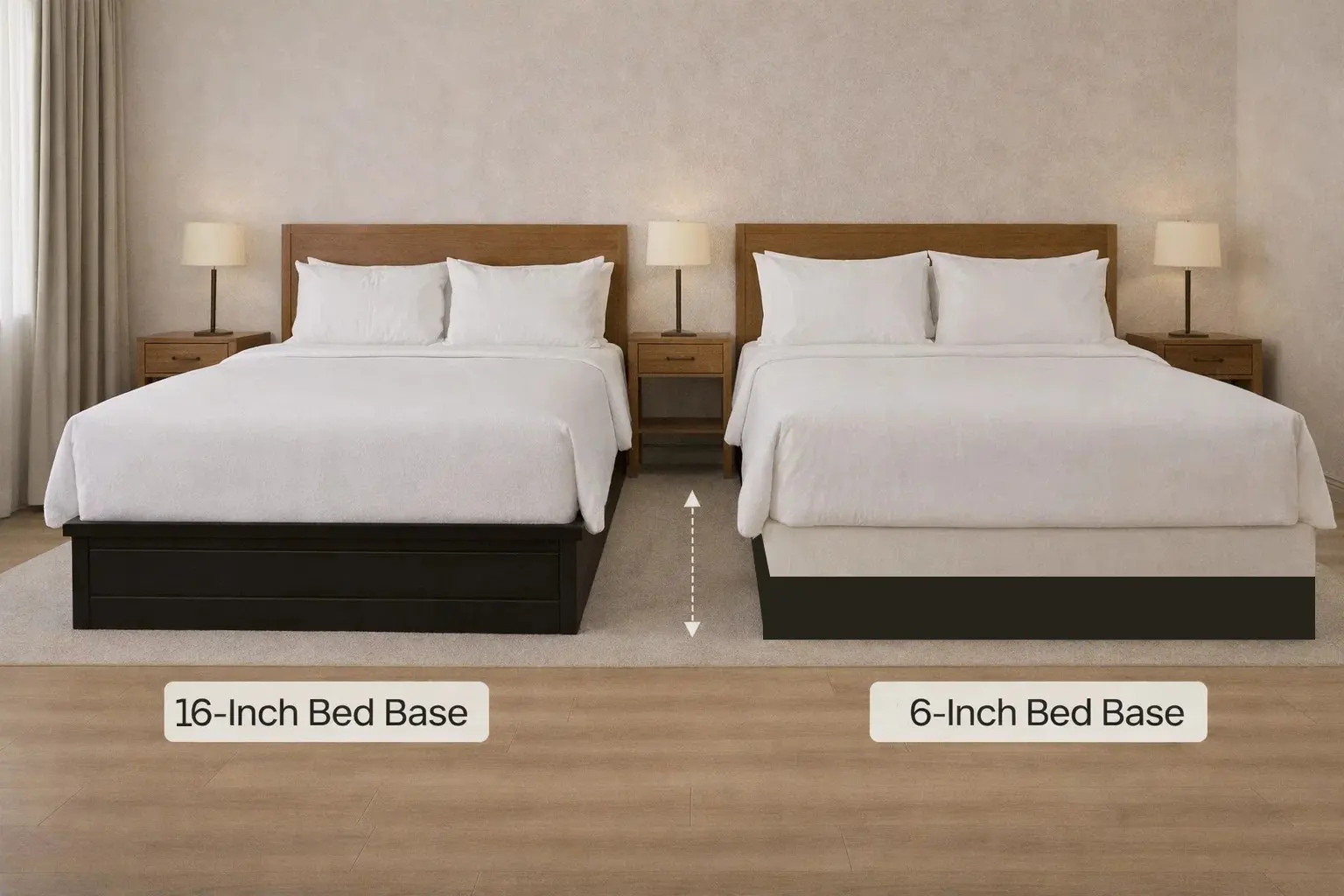 In commercial lodging environments, the bed base is structural infrastructure. It affects housekeeping efficiency, maintenance cycles, lifecycle cost and guest comfort. Selecting between a 6″ metal bed base and a 16″ platform system is not trend-driven; the decision is fundamentally operational.