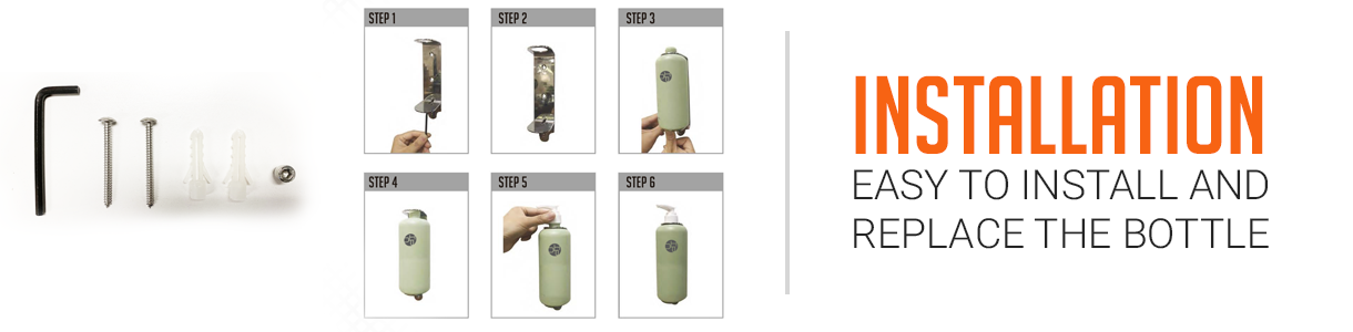 The dispenser includes two fixing stainless steel screws and an adjustable back plate that moves up and down to fit different bottle sizes and styles, it is then locked in place with an Allen key. It allows you to wall mount body wash, shampoo, conditioner, or lotion in an easily accessible, mess and waste-free method. The bracket is made out of stainless steel and is rustproof and has been designed to last, suiting showers and other wet areas of hotel washrooms, even the laundry room and others.