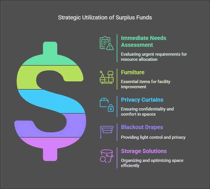Many facilities find themselves with surplus funds that need to be utilized before the fiscal year ends. Conducting a quick audit of immediate needs—such as furniture, privacy curtains, blackout drapes, storage solutions, and other essentials—can help ensure that the budget is spent on necessary improvements rather than forfeited.