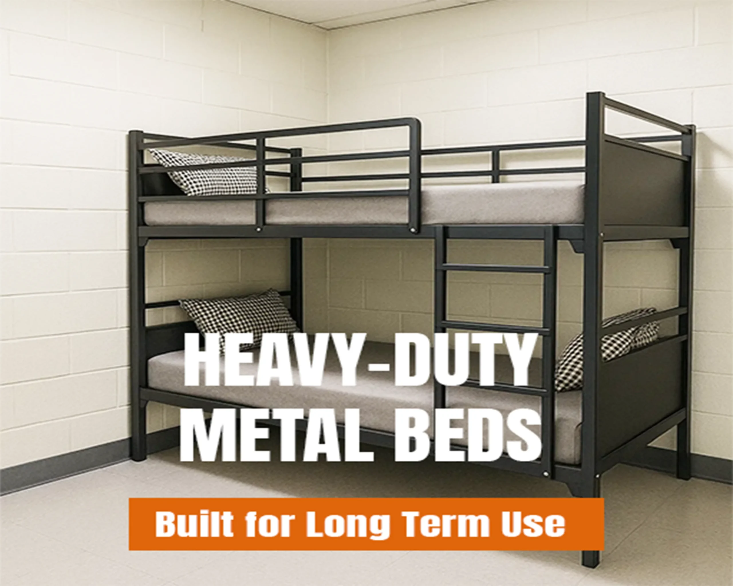 Robust, space-saving metal bed frames ideal for shelters, workforce housing, camps, and student accommodations.
